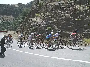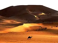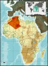 Dans le Sahara méridional, au sud-est du Tademaït, s'étend le massif du Hoggar, dont le point culminant est le mont Tahat (2 918 mètres), en même temps que celui de l'Algérie. Certaines sources font état d'une altitude de 3 003 m[31]. Il est constitué de roches magmatiques formant des pics, des « aiguilles volcaniques » et de hauts plateaux désertiques. Plusieurs cônes et cratères témoignant d'une activité volcanique jadis intense parsèment le paysage. Cette activité remonte à l'ère Cénozoïque, plus précisément du Pliocène final au Pléistocène initial. À l'est, dans le tassili n'Ajjer, haut plateau aride perché à plus de mille mètres d'altitude, se dressent des formations rocheuses fortement érodées émergeant des dunes, donnant parfois au relief un aspect de paysage lunaire.