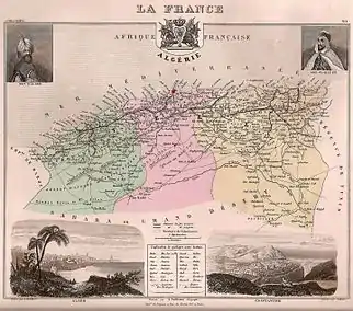 L'appellation française « Algérie », provenant du nom de la ville d'Alger, fut officialisée en français sur initiative du maréchal Soult en 1837 dans le but de remplacer l’appellation « possessions françaises du Nord de l'Afrique »[17]. Le nom « Alger » dériverait du catalan Aljer, lui-même tiré de Djezaïr, nom donné par Bologhine ibn Ziri[18], fils de Ziri ibn Menad fondateur de la dynastie berbère des Zirides, lorsqu'il bâtit la ville en 960 sur les ruines de l'ancienne ville au nom romain Icosium, Djaza'ir Beni Mezghenna[Note 4].