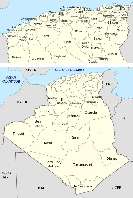 Sur le plan administratif, l'Algérie est divisée en 58 wilayas. La wilaya constitue une circonscription administrative, sorte de préfecture, dotée d'une assemblée élue, l'Assemblée populaire de wilaya (APW), et placée sous l'autorité d'un wali (préfet)[48] nommé par le président de la République. Elles sont divisées en daïras, lesquelles sont divisées à leur tour en communes (au nombre de 1 541). Chaque commune possède sa propre instance délibérante, l'Assemblée populaire communale (APC), qui élit elle-même son président, faisant office de maire. Chaque wilaya et daïra porte le nom de son chef-lieu et a un budget indépendant, collecté au niveau local.
