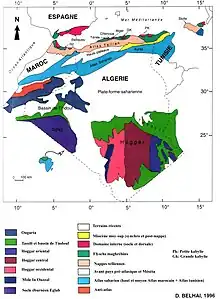 - un domaine méridional, le Sahara, où affleurent les socles précambriens du Hoggar et des Eglab, et leur couverture phanérozoïque de la plateforme saharienne ;