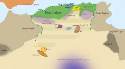 Le terme arabe al Jaza'ir est utilisé depuis l'établissement des trois régences ottomanes au Maghreb (Alger, Tunis et Tripoli), pour désigner le pays qu'Alger commandait. Cependant le terme Dzayer a continué d'être employé dans la langue courante pour désigner la ville du Dey, autrement dit Alger[24]. al Jaza'ir. Le nom que prit cette nouvelle entité politique recouvre pour l'essentiel ce qu'on entendait auparavant par al-maghrib al-awsat. Le territoire était appelé à l'époque qotr al-jaza'ir (qotr : territoire, province), watan al-jaza'ir (watan : patrie, pays) et al-jaza'ir tout court[19]. Par une lettre célèbre aux oulémas de Fès, l'Abdelkader ibn Muhieddine parlait de watan al Jaza'ir (la patrie d'Algérie/Alger)[24]. En outre un poète tlemcénien du XIXe siècle chante : « Mon Dieu, veille sur al Jaza'ir », pour désigner le territoire dont Alger est la ville capitale[24].