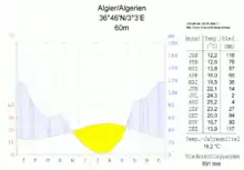 Le centre de climatologie de l'Algérie est sous la responsabilité de l'Office national de météorologie[32]. Un climat méditerranéen couvre le Nord, tandis qu’un climat désertique règne sur le Sud. À Alger, le mois le plus chaud de l’été est août[33]. Le Sahara est une région très ventée et aride. Les amplitudes thermiques sont généralement considérables à cause de la sécheresse de l'air. En Algérie, le temps est généralement ensoleillé, il avoisine 3 650 heures de soleil par an[34].