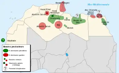 Au sud de la région du Tell, les cours d'eau ne sont pas permanents. Il existe de nombreux lacs dans les régions désertiques, mais ce sont des lacs temporaires et salés pour la majorité comme Chott ech Chergui et Chott el Hodna. Les cours d'eau du Tell se déversent dans la Méditerranée. Mais, ceux qui descendent vers l'Atlas saharien font partie de la plus grande réserve d'eau au monde. Ils forment une nappe phréatique dite la nappe de l'Albien, qui constitue selon certaines estimations la plus grande réserve d'eau douce au monde[57], elle est enfouie sous le sable du désert algérien sur une superficie totale estimée à 900 000 km2[58]. La région d'Adrar a par ailleurs de grandes réserves hydriques constituées de la nappe du continental intercalaire.