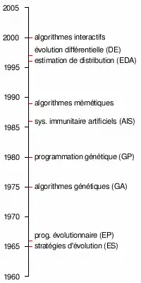 Historiquement, trois grandes familles d'algorithmes ont été développées indépendamment, entre la moitié des années 1960 et 70. Les premières méthodes furent les stratégies d'évolution[2], proposées par I. Rechenberg en 1965, pour résoudre des problèmes d'optimisations continus. L'année suivante, Fogel, Owens et Walsh conçoivent la programmation évolutionnaire[3] comme une méthode d'intelligence artificielle pour la conception d'automates à états finis. Enfin, en 1975, J. H. Holland propose les premiers algorithmes génétiques[4], pour l'optimisation combinatoire. La parution en 1989 du livre de D. E. Goldberg sur les algorithmes génétiques[5] rendra ceux-ci particulièrement populaires.
