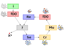 i : initialisation, f(X) : évaluation, ? : critère d'arrêt, Se : sélection, Cr : croisement, Mu : mutation, Re : remplacement, X* : optimum.