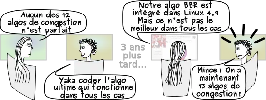 C'est ainsi que TCP va essayer de deviner le meilleur débit à utiliser en essayant de toujours augmenter le débit jusqu'à la survenue d'une perte de paquet parce que le réseau n'arrive pas à absorber tout le débit. En effet, les réseaux informatiques sont conçus pour être les plus simples possibles et c'est la seule possibilité qu'a un réseau pour avertir les utilisateurs qu'il est saturé.