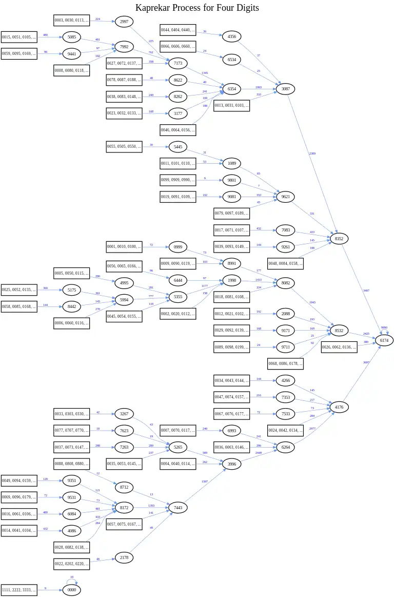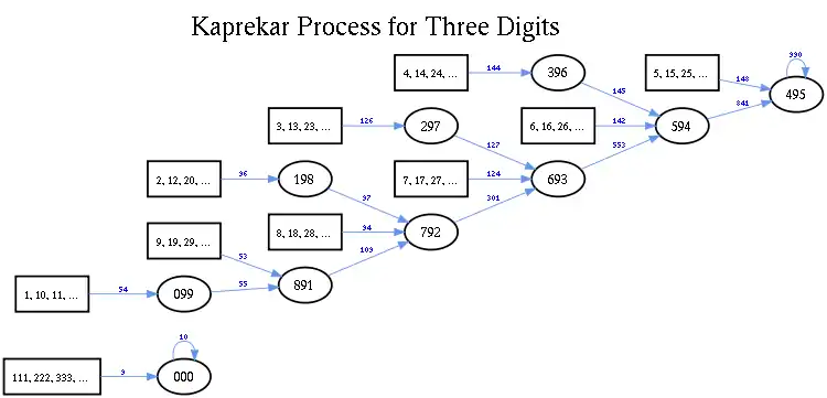 - soit en considérant un nombre réductible de chiffres, en ignorant tous les chiffres nuls avant de les ranger dans n1 et n2 : c'est la définition stricte (celle voulue par Kaprekar, où les chiffres nuls sont toujours rangés au début en poids fort, avant tous les autres).