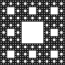- Les fractales ont cette propriété d'autosimilarité, mais elles ont plutôt à voir avec le concept un peu différent qui s'appelle la corécursivité (en) (ou corécursion). Le tapis de Sierpiński, du nom de Wacław Sierpiński, est une fractale obtenue à partir d'un carré. Le tapis se fabrique en découpant le carré en neuf carrés égaux avec une grille de trois par trois, et en supprimant la pièce centrale, et en appliquant cette procédure récursivement aux huit carrés restants.