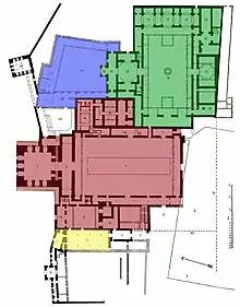 Plan des palais nasrides. En jaune : le Mexuar ; en rouge : le palais de Comares ; en vert : le palais des Lions ; en bleu : les logis de l'empereur.