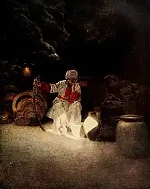 Pour se venger, quelque temps après, le chef des bandits s'établit comme commerçant et se lie d'amitié avec le fils d'Ali Baba, désormais chargé des affaires commerçantes de Cassim. Le chef des bandits est invité à dîner chez Ali Baba, où Morgiane le reconnaît. Celle-ci effectue alors une danse munie d'une dague qu'elle plonge dans le cœur du bandit.