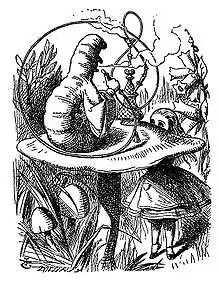 Une mélopée et des volutes de fumée attirent alors Alice jusqu'à une chenille qui chante, déclame des vers et fume le narguilé juchée sur un champignon. Les volutes prennent la forme des lettres ou des mots qu'elle prononce. Alice et la Chenille entament une conversation philosophique sur ce que l'on est et qui l'on est. Évoquant son problème de petite taille (10 cm), Alice rend la Chenille furieuse car c'est aussi sa taille. Explosant de rage, la Chenille se transforme en papillon et donne un conseil à Alice : un côté du champignon la fera grandir, l'autre rapetisser. Alice s'exécute et grandit jusqu'à dépasser la cime des arbres et déloger un oiseau et son nid. L'oiseau la prend pour un serpent et l'attaque. Pour s'échapper, Alice mange l'autre côté du champignon et, après deux essais, retrouve une taille normale. Elle décide de conserver les morceaux dans son tablier au cas où.