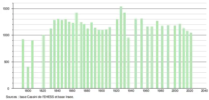 L'évolution du nombre d'habitants est connue à travers les recensements de la population effectués dans la commune depuis 1793. Pour les communes de moins de 10 000 habitants, une enquête de recensement portant sur toute la population est réalisée tous les cinq ans, les populations légales des années intermédiaires étant quant à elles estimées par interpolation ou extrapolation[36]. Pour la commune, le premier recensement exhaustif entrant dans le cadre du nouveau dispositif a été réalisé en 2006[37].