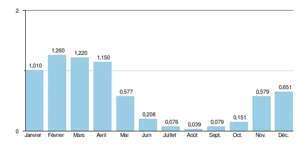 Sur cette courte période d'observation de vingt-cinq ans, le débit journalier maximal a été observé le pour 93,2 m3/s. Le débit instantané maximal a été observé le [note 2] avec 362,0 m3/s en même temps que la hauteur maximale instantanée de 395 mm soit 3,95 m[2].