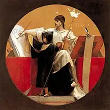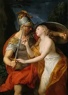 Allégorie personnification. Dans La Guerre et la Paix de Batoni (1776), la Paix offre à la Guerre un rameau d'olivier.