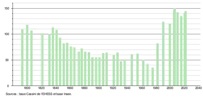 L'évolution du nombre d'habitants est connue à travers les recensements de la population effectués dans la commune depuis 1793. Pour les communes de moins de 10 000 habitants, une enquête de recensement portant sur toute la population est réalisée tous les cinq ans, les populations légales des années intermédiaires étant quant à elles estimées par interpolation ou extrapolation[24]. Pour la commune, le premier recensement exhaustif entrant dans le cadre du nouveau dispositif a été réalisé en 2005[25].