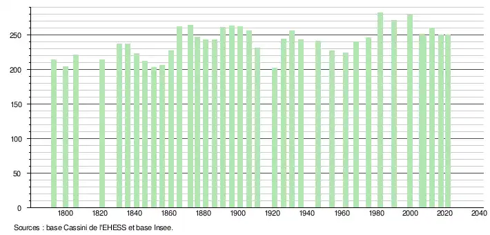 L'évolution du nombre d'habitants est connue à travers les recensements de la population effectués dans la commune depuis 1793. Pour les communes de moins de 10 000 habitants, une enquête de recensement portant sur toute la population est réalisée tous les cinq ans, les populations légales des années intermédiaires étant quant à elles estimées par interpolation ou extrapolation[26]. Pour la commune, le premier recensement exhaustif entrant dans le cadre du nouveau dispositif a été réalisé en 2007[27].