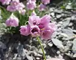 Fleurs hermaphrodites regroupées en ombelle simple. L'ombelle comporte assez peu de fleurs (de 3 à 8), elle est longtemps pendante mais se redresse un peu en pleine floraison. Fleurs roses plus ou moins pourprées ou violacées, relativement grandes (1 à 1,5 cm), à 6 tépales souvent terminés par une petite pointe. La spathe se divise en lanières blanches moins longues que l'ombelle. Pollinisation par les insectes.