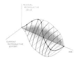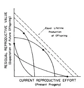 Le trade-off entre la reproduction courante et l’espérance d’une reproduction future à un âge donné, peut être représenté graphiquement en représentant la valeur reproductive résiduelle en fonction de l’effort reproducteur courant à un instant (ou un âge) donné[3]. Les formes hypothétiques du trade-off représentent les différentes possibilités avec lesquelles varient les bénéfices en matière de reproduction future par rapport aux coûts sur la reproduction courante (et vice versa). En tout point de cette relation, la seule façon d’augmenter la valeur reproductive résiduelle est de diminuer l’effort reproducteur courant, et vice versa.