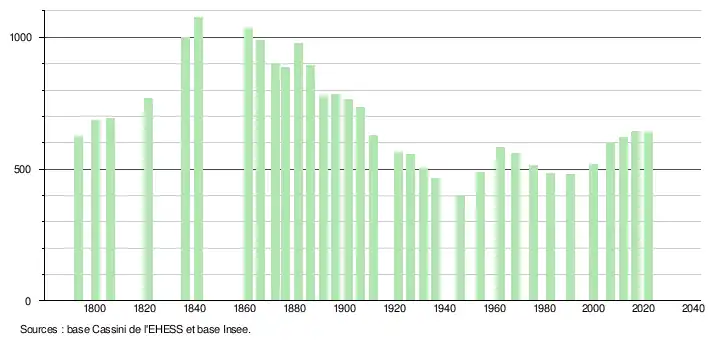 L'évolution du nombre d'habitants est connue à travers les recensements de la population effectués dans la commune depuis 1793. Pour les communes de moins de 10 000 habitants, une enquête de recensement portant sur toute la population est réalisée tous les cinq ans, les populations légales des années intermédiaires étant quant à elles estimées par interpolation ou extrapolation[17]. Pour la commune, le premier recensement exhaustif entrant dans le cadre du nouveau dispositif a été réalisé en 2006[18].