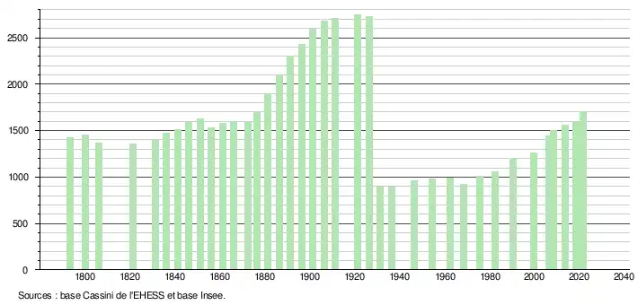 L'évolution du nombre d'habitants est connue à travers les recensements de la population effectués dans la commune depuis 1793. Pour les communes de moins de 10 000 habitants, une enquête de recensement portant sur toute la population est réalisée tous les cinq ans, les populations légales des années intermédiaires étant quant à elles estimées par interpolation ou extrapolation[34]. Pour la commune, le premier recensement exhaustif entrant dans le cadre du nouveau dispositif a été réalisé en 2008[35].