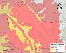 Le retrait-gonflement des sols argileux est susceptible d'engendrer des dommages importants aux bâtiments en cas d’alternance de périodes de sécheresse et de pluie. 97,2 % de la superficie communale est en aléa moyen ou fort (67,4 % au niveau départemental et 48,5 % au niveau national). Sur les 385 bâtiments dénombrés sur la commune en 2019, 370 sont en aléa moyen ou fort, soit 96 %, à comparer aux 81 % au niveau départemental et 54 % au niveau national. Une cartographie de l'exposition du territoire national au retrait gonflement des sols argileux est disponible sur le site du BRGM[23],[Carte 3].