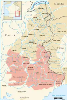- la quasi-totalité des Hautes-Alpes, sauf le Valgaudemar, le Champsaur, La Grave, Villar-d'Arêne, la vallée Étroite et quelques arpents de terre au sud du mont Chaberton ;
