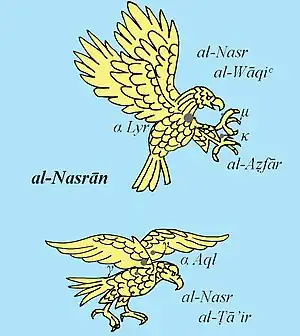 Mais ces derniers connaissaient déjà, dans le ciel arabe traditionnel, cette étoile sous le nom de الطائر النسر al-Nasr al-Ṭā’ir, « l’Aigle Volant », qui forme, dans le ciel arabe traditionnel, un couple avec النسر الواقع al-Nasr al-Wāqiᶜ, « l’Aigle Tombant » , qui désigne α Lyr[17], mais il est clair que cette aigle-là, celui qui est identifié à α Aql, et qui appartient aux premiers calendriers arabes de type παράπηγμα ou calendriers de anwā’, est un héritage direct de Mésopotamie par une voie araméenne[18].