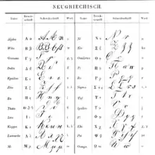 Ci-dessous se trouve un tableau donnant une liste des principales lettres grecques, augmentée de leur romanisation, des lettres phéniciennes dont les grecques sont dérivées. La transcription phonétique utilise l'alphabet phonétique international. La prononciation indiquée pour le grec ancien est une prononciation restituée, dite « érasmienne »[N 3]. Elle est partiellement fautive, et son usage est surtout scolaire. Elle s'efforce d'indiquer la prononciation de la lettre en attique à la fin du Ve et au début du IVe siècle av. J.-C.
