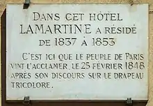 À la fin des années 1860, quasiment ruiné, il vend sa propriété à Milly et accepte l'aide d'un régime qu'il réprouve mais qui le loge gracieusement à Paris, dans un chalet du bois de Boulogne situé au bout de l'actuelle avenue Henri-Martin (au niveau des actuels 107-113)[42]. C'est là, au 135 avenue de l'Empereur, non loin de l'actuel square Lamartine, qu'il meurt en 1869, deux ans après une attaque l'ayant réduit à la paralysie. Ses funérailles, à Mâcon, ne sont suivies d'aucun ancien responsable républicain de 1848, à l'exception d’Émile Ollivier, que l'on peut considérer comme son fils spirituel (il lui succédera d'ailleurs à l'Académie française).
