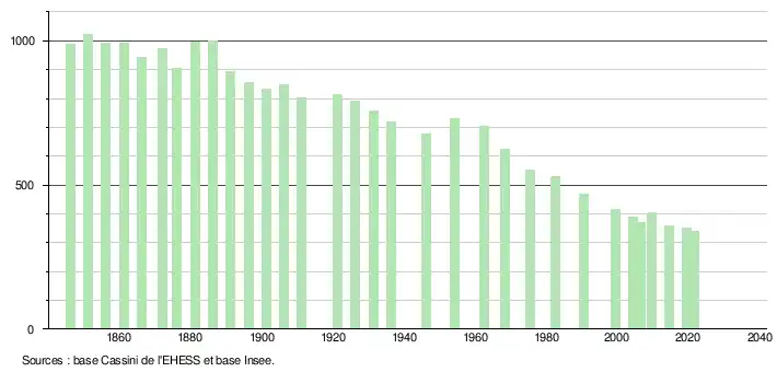 L'évolution du nombre d'habitants est connue à travers les recensements de la population effectués dans la commune depuis 1846. Pour les communes de moins de 10 000 habitants, une enquête de recensement portant sur toute la population est réalisée tous les cinq ans, les populations légales des années intermédiaires étant quant à elles estimées par interpolation ou extrapolation[47]. Pour la commune, le premier recensement exhaustif entrant dans le cadre du nouveau dispositif a été réalisé en 2004[48].