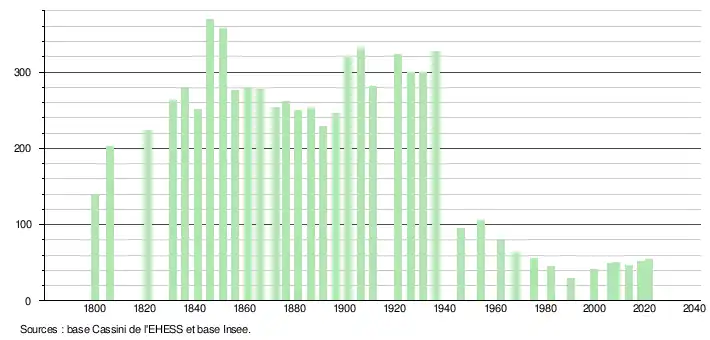 L'évolution du nombre d'habitants est connue à travers les recensements de la population effectués dans la commune depuis 1800. Pour les communes de moins de 10 000 habitants, une enquête de recensement portant sur toute la population est réalisée tous les cinq ans, les populations légales des années intermédiaires étant quant à elles estimées par interpolation ou extrapolation[8]. Pour la commune, le premier recensement exhaustif entrant dans le cadre du nouveau dispositif a été réalisé en 2008[9].