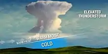 De même, les orages d'hiver qui se produisent à l'est des montagnes Rocheuses ne sont pratiquement jamais des orages de masse d'air mais sont associés à des passages frontaux[5],[6]. De plus, la convection associée à ces orages ne part en général pas du sol et elle est initiée aux niveaux moyens de l'atmosphère. Donc, les nuages qui engendrent ces orages sont des altocumulonimbus. Toutefois, il peut être discutable d'appeler ces nuages cumulonimbus altocumulogenitus car en général ces cellules orageuses peuvent être noyées dans un système généralisé de mauvais temps. Vu du sol, un tel nuage sera appelé nimbostratus car on ne verra qu'une masse grise uniforme noyée par la pluie. Cependant, vu d'avion, on reconnaîtra aisément les sommets des altocumulonimbus qui auront la forme de tours se détachant au-dessus de la masse nuageuse.