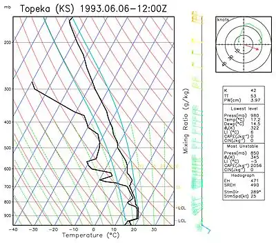 | Sondage associé à la ligne d'altocumulonimbus en photo de titre | Sondage à Topeka lors de pluies diluviennes |