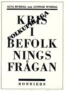 Alva Reimer Myrdal attire l'attention pour la première fois dans les années 1930 et est l'un des principaux moteurs de la création de l'État-providence suédois[réf. nécessaire]. En 1934, elle publie avec Gunnar Myrdal Kris i Befolkningsfrågan (La question de la population en crise[2] ; en anglais « The Crisis in the Population »), émettant que le principe de base sur cette question serait de trouver les réformes sociales nécessaires pour permettre la liberté individuelle (en particulier pour les femmes) tout en promouvant la procréation et en encourageant les Suédois à avoir des enfants[réf. nécessaire]. Ce livre souligne aussi l'importance de la responsabilité partagée dans l'éducation des enfants, aussi bien entre les parents qu'avec la communauté avec des éducateurs d'enfants formés[réf. nécessaire].