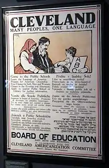 Le mouvement d'américanisation est une démarche organisée à l'échelle nationale dans les années 1910 pour intégrer des millions d'immigrants récents dans le système culturel américain. Plus de trente États adoptent des lois exigeant des programmes d'américanisation. Dans des centaines de villes, la chambre de commerce organisr des cours d'anglais et d'éducation civique américaine. De nombreuses usines coopérent. Plus de 3 000 commissions scolaires, en particulier dans le Nord-Est et le Midwest, organisent des cours après l'école et le samedi. Les syndicats, en particulier celui des mineurs de charbon (United Mine Workers of America), aident leurs membres à obtenir des papiers de citoyenneté. Dans les villes, les associations YMCA et YWCA sont particulièrement actives, tout comme les organisations de descendants de la génération fondatrice, telles que les Filles de la révolution américaine. Le mouvement atteint son apogée pendant la Première Guerre mondiale, lorsque les jeunes hommes immigrés remplissant les conditions requises sont enrôlés dans l'armée et que la nation s'efforce d'intégrer les groupes ethniques européens dans l'identité nationale[2].