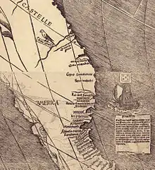 En 1507, Martin Waldseemüller, le cartographe d'une société savante du duché de Lorraine, dénommée Gymnase Vosgien et située à Saint-Dié-des-Vosges, produit avec l'aide de l'érudit Mathias Ringmann un planisphère intitulé Universalis Cosmographia représentant la région méridionale de l'Amérique. Cette mappemonde est la première carte sur laquelle apparaît le mot « America », prénom féminisé attribué en l'honneur du navigateur florentin Amerigo Vespucci[3] (Amerigo est l’équivalent italien du prénom d'origine germanique « Aymeric », variante méridionale de « Henri »). Cet explorateur est le premier à émettre la thèse d'un nouveau continent lors de son expédition au sud de la Patagonie en 1502. Cette quatrième partie du monde, qui s'ajoute au supercontinent de l'Afro-Eurasie, vient alors modifier les assertions de Christophe Colomb qui, en 1492, croyant avoir découvert la route des Indes, rencontra plutôt ceux qui, aujourd'hui, sont désignés par métonymie sous l'appellation « Amérindiens » ou « Indiens d'Amérique » (au Canada francophone, ces appellations sont souvent considérées comme péjoratives et d'autres appellations leur sont aujourd'hui préférées telles que : « Premières Nations », « Natifs »).