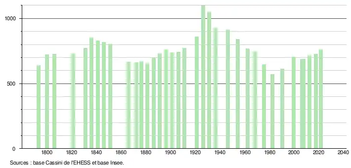 L'évolution du nombre d'habitants est connue à travers les recensements de la population effectués dans la commune depuis 1793. Pour les communes de moins de 10 000 habitants, une enquête de recensement portant sur toute la population est réalisée tous les cinq ans, les populations légales des années intermédiaires étant quant à elles estimées par interpolation ou extrapolation[18]. Pour la commune, le premier recensement exhaustif entrant dans le cadre du nouveau dispositif a été réalisé en 2007[19].