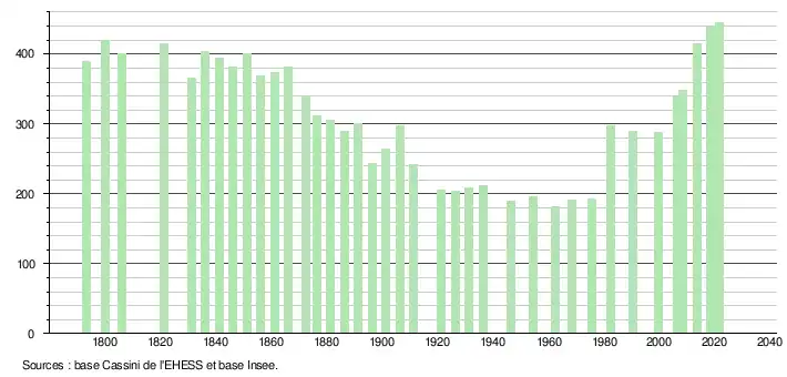 L'évolution du nombre d'habitants est connue à travers les recensements de la population effectués dans la commune depuis 1793. Pour les communes de moins de 10 000 habitants, une enquête de recensement portant sur toute la population est réalisée tous les cinq ans, les populations légales des années intermédiaires étant quant à elles estimées par interpolation ou extrapolation[14]. Pour la commune, le premier recensement exhaustif entrant dans le cadre du nouveau dispositif a été réalisé en 2008[15].