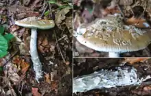Amanita basiana est une espèce morphologiquement très proche qui a été récoltée à proximité de Gène en Ligurie (Italie) dans l'herbe de pinèdes sèches de Pin maritime non loin de la côte méditerranéenne. Cette espèce se différencie par son habitat radicalement différent ; son chapeau moins large mesurant de 30 à 55 mm de diamètre, avec un maximum de 80 mm ; un voile universel aux sphérocystides moins nombreuses, ce qui contribue à un délitement distinct sur le chapeau et par des spores plus fines[20].