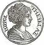 Une tradition située à la frontière de l’histoire et du mythe attribue à Alexandre le Grand une rencontre avec la reine des Amazones, Thalestris (ou Myrina). Cette tradition issue de la Vulgate d'Alexandre (Diodore, Quinte-Curce, Justin[33]) provient de Clitarque et d’Onésicrite, contemporains des conquêtes de l’Asie dont les récits délivrent une part de fables et de merveilleux. Un historien de la conquête, non identifié[34], juge qu’Alexandre se doit de rencontrer les Amazones car Héraclès et Achille, ses ancêtres mythiques, les ont combattues.