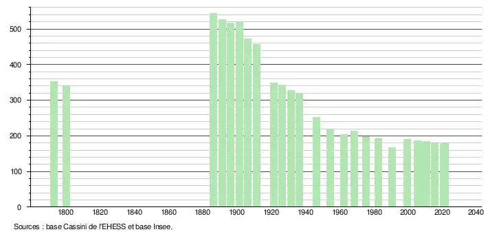 L'évolution du nombre d'habitants est connue à travers les recensements de la population effectués dans la commune depuis 1793. Pour les communes de moins de 10 000 habitants, une enquête de recensement portant sur toute la population est réalisée tous les cinq ans, les populations légales des années intermédiaires étant quant à elles estimées par interpolation ou extrapolation[49]. Pour la commune, le premier recensement exhaustif entrant dans le cadre du nouveau dispositif a été réalisé en 2005[50].