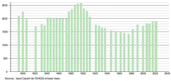L'évolution du nombre d'habitants est connue à travers les recensements de la population effectués dans la commune depuis 1793. Pour les communes de moins de 10 000 habitants, une enquête de recensement portant sur toute la population est réalisée tous les cinq ans, les populations légales des années intermédiaires étant quant à elles estimées par interpolation ou extrapolation[16]. Pour la commune, le premier recensement exhaustif entrant dans le cadre du nouveau dispositif a été réalisé en 2005[17].