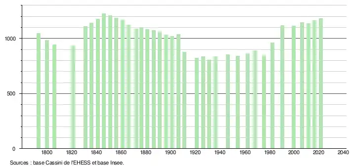 L'évolution du nombre d'habitants est connue à travers les recensements de la population effectués dans la commune depuis 1793. Pour les communes de moins de 10 000 habitants, une enquête de recensement portant sur toute la population est réalisée tous les cinq ans, les populations légales des années intermédiaires étant quant à elles estimées par interpolation ou extrapolation[24]. Pour la commune, le premier recensement exhaustif entrant dans le cadre du nouveau dispositif a été réalisé en 2006[25].