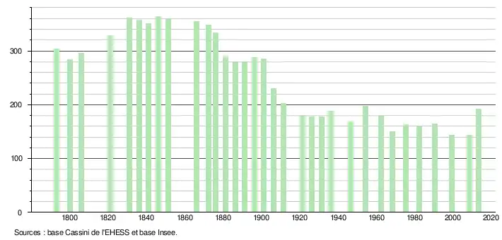 L'évolution du nombre d'habitants est connue à travers les recensements de la population effectués dans la commune depuis 1793. À partir du , les populations légales des communes sont publiées annuellement dans le cadre d'un recensement qui repose désormais sur une collecte d'information annuelle, concernant successivement tous les territoires communaux au cours d'une période de cinq ans. Pour les communes de moins de 10 000 habitants, une enquête de recensement portant sur toute la population est réalisée tous les cinq ans, les populations légales des années intermédiaires étant quant à elles estimées par interpolation ou extrapolation[4]. Pour la commune, le premier recensement exhaustif entrant dans le cadre du nouveau dispositif a été réalisé en 2008[5],[Note 1].
