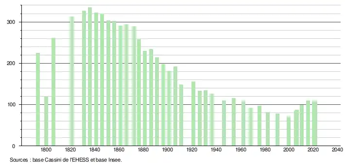 L'évolution du nombre d'habitants est connue à travers les recensements de la population effectués dans la commune depuis 1793. Pour les communes de moins de 10 000 habitants, une enquête de recensement portant sur toute la population est réalisée tous les cinq ans, les populations légales des années intermédiaires étant quant à elles estimées par interpolation ou extrapolation[29]. Pour la commune, le premier recensement exhaustif entrant dans le cadre du nouveau dispositif a été réalisé en 2005[30].