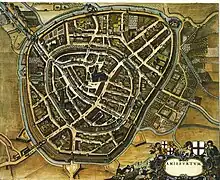 Une première enceinte fortifiée, faite de brique, fut achevée vers 1300, mais il devint bientôt évident qu'il fallait agrandir cette enceinte et vers 1380 on entreprit la construction d'une nouvelle muraille, travail qui fut mené à terme en 1450. La célèbre Koppelpoort, qui tient à la fois du pont et du pont levis, fait partie de cette seconde enceinte. L'enceinte intérieure fut abattue, permettant la création de nouvelles maisons dites Muurhuizen : ainsi l'actuelle Muurhuizenstraat reprend l'emplacement exact de cette muraille primitive ; les façades des maisons sont construites sur les fondations mêmes du mur.