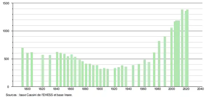 L'évolution du nombre d'habitants est connue à travers les recensements de la population effectués dans la commune depuis 1793. Pour les communes de moins de 10 000 habitants, une enquête de recensement portant sur toute la population est réalisée tous les cinq ans, les populations légales des années intermédiaires étant quant à elles estimées par interpolation ou extrapolation[28]. Pour la commune, le premier recensement exhaustif entrant dans le cadre du nouveau dispositif a été réalisé en 2004[29].