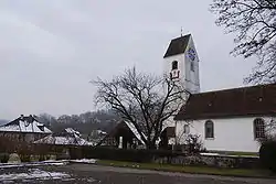 L'église paroissiale réformée est composée d'une nef unique en style roman tardif, à laquelle un chœur fut adjoint en 1640. Le clocher a un toit en bâtière. Elle forme un tout avec la cure en style néo-classique bâtie par Carl Ahasver de Sinner en 1783 et un grenier prébendier avec galerie couverte datant de 1685[3].