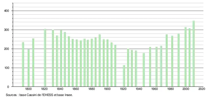 L'évolution du nombre d'habitants est connue à travers les recensements de la population effectués dans la commune depuis 1793. À partir du , les populations légales des communes sont publiées annuellement dans le cadre d'un recensement qui repose désormais sur une collecte d'information annuelle, concernant successivement tous les territoires communaux au cours d'une période de cinq ans. Pour les communes de moins de 10 000 habitants, une enquête de recensement portant sur toute la population est réalisée tous les cinq ans, les populations légales des années intermédiaires étant quant à elles estimées par interpolation ou extrapolation[17]. Pour la commune, le premier recensement exhaustif entrant dans le cadre du nouveau dispositif a été réalisé en 2004[18],[Note 1].