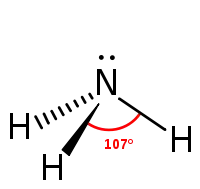 - L'agencement de la molécule est pyramidale, avec une distance N-H équivalant à 1 Å, et un angle HNH de l'ordre de 107°.